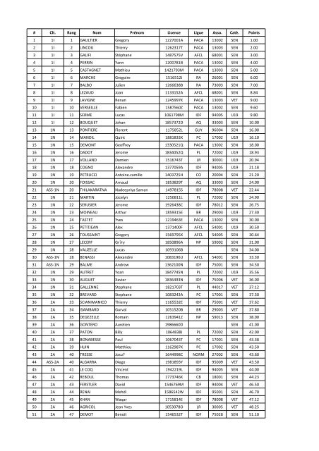 Rang Nom Prénom Licence Ligue Points 1 1I 1 GAULTIER